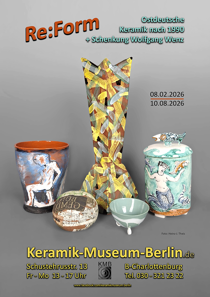 In der 126. Sonderausstellung des Keramik-Museum Berlin (KMB) werden sowohl Geschenke, die der Förderverein KMB in den letzten beiden Jahren für seine Sammlung erhalten hat, als auch einige Neuerwerbungen präsentiert. Zur Ausstellungseröffnung am 14.11., um 19 Uhr, wurde dem Verein als Highlight eine besondere Jian-Teeschale mit Ölflecken-Glasur übereignet. Sie stammt von dem chinesischen Künstler Yiyun Ye aus Fujian, wurde im vergangenen Jahr gefertigt und trägt den Werktitel „Meteoritenkrater-Leuchtwandel“. Zur Eröffnung übermittelte der Kommissarische Direktor des Chinesischen Kulturzentrums Berlin, Herr Wenbo He, einige Grußworte und der in Berlin lebende Neffe des Künstlers, Herr Juntao Ye, erzählte etwas über die Teeschale seines Onkels. Umrahmt wurde die Veranstaltung mit Musik auf der traditionellen chinesischen Zither Guzheng, dargeboten von Frau Ariel Qiu. Weitere Geschenke, die in der Kabinettausstellung bis 23. März 2026 präsentiert werden, sind vornehmlich Objekte aus den 1920er Jahren, darunter drei Vasen von dem berühmten Jugendstil-Künstler Max Laeuger (1864-1952)/Karlsruhe, ein Konvolut mit Steinzeuggefäßen aus Königsbrück, dekoriert von dem Dresdener Maler Max Schleinitz (1880-1935), Gefäße aus der Königlichen Majolika-Manufaktur Cadinen/Westpreußen, ein Kaffeeservice aus den Steingutfabriken Velten-Vordamm (1920er Jahre) mit dem von Charlotte Hartmann entworfenen Dekor „Paradiesgarten“, sowie keramische Bildplatten von Siegmund Schütz/KPM, Pasquale Liguori (*1964), Vietri sul Mare/Italien, Jörg von Manz (1939-1997), Fridegart Glatzle (1920-2015)/Karlsruhe, sowie einige weitere Arbeiten zeitgenössischer Künstler. Bilder der Ausstellung finden Sie hier: www.facebook.com/keramikmuseum.berlin/